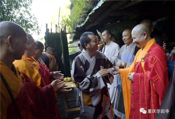 香赞毕,关房门开启,道坚法师缓缓走出关房,带领护关人员礼谢大众。在场僧俗纷纷祝贺道坚法师圆满出关,然后护送道坚法师下山回华岩寺。