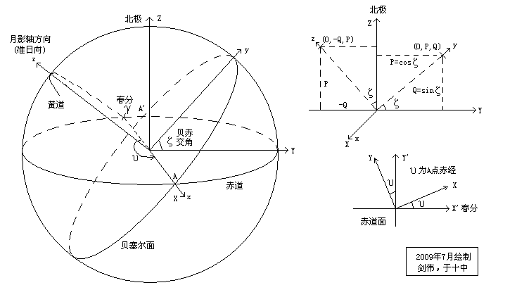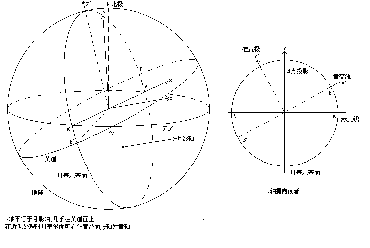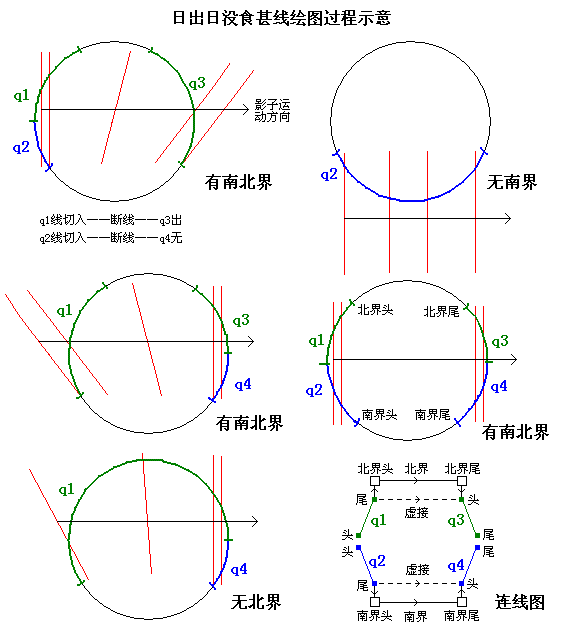 依上图建立椭圆方程 (x/a)2+(y/b)2=1,把x = -r*cosζ,y = r*sinζ代入得: 2、贝赤交线与贝黄交线的夹角 应用三垂线定理易证得自转轴总是在yz平面。由于太阳距我们很远,月球则要近得多,所以月球的移动对月影轴方向的影响是轻微的,月影轴的方向主要有太阳决定,基本与太阳相同,因此,如果太阳赤纬为负时,上图中y应画在北极左边。这就是说随着太阳运转,赤纬变化,北极在y轴上左右移动。 由于太阳黄纬小于2角秒且太阳视差小于10角秒,所以基面基本垂直于黄道面,当月影轴经过地球,基面与黄轴的夹角不超过10角秒。虽然,实际计算不推荐看成垂直,但建立这样一种概念有利于坐标变换。贝黄交角:约为90度。 下图则给出贝塞尔坐标、黄道、赤道、基面等的示意图: ![]() 图中∠BOA可按以下方法得到:由黄赤变换公式sinδ = sinβ cosε + cosβ sinε sinλ,A点赤纬是δ=0,B点黄经λ=υ,代入得tanβ = -tanε sinλ = -tanε sin(υ)。贝圆几乎垂直于黄道,所以A的黄纬β近似为∠BOA,则有tan∠BOA = -tanε sinυ 3、半影与贝圆的交点(求两圆交点,贝圆用地球平均半径) ![]() 4、半影与贝圆的交点(求两圆交点,贝圆看作椭圆) 方法与求角圆与圆的交点基本相同,但要多做一次重复计算。 5、半影与贝圆的交点(精确求法) 6、半影与贝圆的切点计算 ![]() 六、在贝塞尔坐标系中求解地球表面某点的速度: ![]() 求某一地标(含海拔)的贝塞尔坐标 求影轴上某点对应的本影和半影半径 影子中心相对于观测点的速度 求某时刻的中心点 地心到直线的距离 ![]() 距离改正 在贝塞尔坐标中,用两点法插值求地月距离(线性插值),会产生一定的误差,建议进行二次函数修正。如图,影足由O运动到A用时T日,角速度为ω ![]() R取地月平均值,以地球赤道半径为单位,即R=385000/6378=60.36,ω为日月黄经差的平均速度0.2128/日,则有f = 1.366(T2-t2),t是以中点O起算的。如果t从B点起算,B运动开A用时T,则f = 1.366t(T-t) 日出日没食甚线的绘图方法 计算的点数是有限的,所以画出的日出日没食甚线不会刚好经过南北界线的头尾端点,以下算法解决上问题。 ![]() 红线是半影直径,它垂直于影子的相对速度方向(影子相对交点上的观测者的速度,它与地球自转有关)。影子速度比贝塞尔平面上地球自转速度大许多,所以红线实际基本垂直于影速方向,倾斜不多。随着影子的移动,红线与贝圆的连续的交点构成日出没食甚线。 上图中的连接图:当北界不存在时,q1连续写点造成q3不存在,因此连线前构造一个q3,即在q3线头写入q1的最后一点;当北界存在时,q1线尾与q3线头分别补上北界的线头和线尾,产生的效果有两个,其一确保q1和q3不为空线,其二使线头连接到北界的端点。q2与q4处理的方法相同。 绘图方法:只要北界存在,不论q1和q3是否存在,q1线尾强制接北界头,q3线头强制接北界尾;如果不存在,q3必不存在,则强制补一个与q1连续的坐标生成一个q3。南界的处理方法类推。最后q1、q2线头连接,q3、q4线尾连接。 |