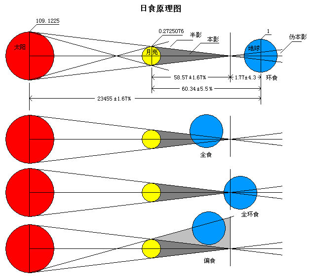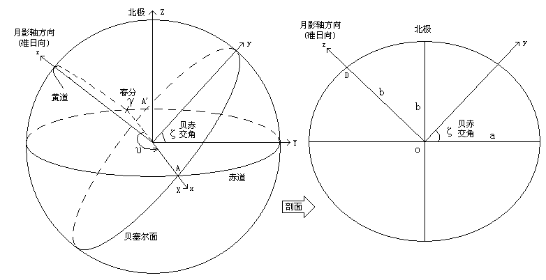 第九章 日食原理 一、月影轴、本影、伪本影、半影、日食类型 月亮遮住了太阳光,使地球在的人们看不见太阳或只看到太阳的一部分,便形成了日食。在任意时刻,月亮的影子总在存在的,当地球进入月亮影子区域,才能看到日食现象。 ![]() 当角度满足一定条件时才能发生日食。即月亮应在地球和太阳之间才可能发生日食。即日月合朔时刻(或此刻附近)才可能发生日食。如果日月合朔时,月亮位置太“高”或太“低”,影子落在地球的上方(北极之上)或下方(南极之下),地球上看不到日食。 当距离满足一定条件时才能发生全食。设地球的赤道半径为1,那么月亮的影子长度约为58.57。地球带着月球围绕着遥远的太阳公转,公转的轨道是个椭圆,所以月亮月有时离太阳近此,有时候远一些,所以影子长度约为58.57±1.67%,这个值与地月距离60.34很接近。月球绕地运动轨道是个偏心率较大的椭圆,地月距60.34±5.5%,因此地月距离可能小于影子长度,形成日食。 二、日食的周期性 三、空间直线与地球的交点 地球的形状可近似为旋转椭球,月影轴或月影锥的母线可以使用一条直线来描述。某时刻月影轴与地球的交点就是该时刻日食的中心点。影锥的各条母线与地球的交点构成影子在地球上的轮廓线。 ![]() 利用直线的参数方程求解比较容易 ![]() 以下示例程序计算直线与地球的交点,直线经过(x1,y1,z1)和(x2,y2,z2)两点,e为极赤径比,r为赤半径: 交点坐标(x,y,z)求出后,交点的经度α = atan2(y,x),地理经度 L = α - g,地心纬度φ'为tanφ' = z / sqrt(x*x+y*y)。地心纬度φ'与地理纬度φ的关系为:tanφ' = (b/a)2tanφ,式中b/a是极半径比赤道半径。显然地心纬度小于地理纬度,在南北极和赤道上二者相等。 最后,地理经度应限制在-180°到+180°,地理纬度应限制在-90°到90°。西方著作中,地理经度往往是向西为正,那么有L = g - α 四、日食计算所用的坐标系 并没有硬性规定要用哪种类型的坐标系。一般的说,精确的日食计算中,常常用到直角坐标系。 (一)坐标变换 (二)贝塞尔坐标系及其变换 贝塞尔坐标系的定义: z轴经过地心且平行于月影轴,往太阳那个方向为正。垂直于月影轴且经过地心的平面为基面。基面与赤道面的交线为x轴,xyz三轴构成右手坐标系。如果规定x轴正方向的赤经比z轴赤经多90度而不是-90度,这样y轴总是在北半球。 ![]() 设z轴上某一点记坐B向量,写为直角坐标形式记作B[0,1,2],jd时刻太阳赤道坐标为S[0,1,2],月亮赤道坐标为M[0,1,2],存在关系式B = S - M。应注意,这个关系式是一个矢量运算关系。当S、M为球面坐标时,请先将它们转为直角坐标,然后再运算。最后得到的B还可以转为球面坐标。因此,在球面坐标系中,z轴向量的赤道坐标表示:B = xyz2llr( llr2xyz(S) - llr2xyz(M) )。实际上,B的方向十分接近太阳,有中心线日食发生期间,B与S的角度差不到10角秒。 贝塞尔坐标变换三要素: 有了以下三个参数,就可以在贝塞尔坐标、赤道坐标、地理坐标之间进行坐标变换。 当z轴向量B求出后,贝赤交角立即得到:ζ= 90-B[1],同时得到A点的赤经(起算点赤经):υ = 90+B[0]。如果天体赤经要转换为以格林尼治子午圈起算的经度,则应将天体赤经减去格林尼治恒星时。格林尼治恒星时是一个角度量,它指格林尼治子午圈相对春风点的赤经(角度)。 已知天体赤道坐标P[]求其贝塞尔坐标: 已知天体贝塞尔坐标P[]求基赤道坐标: 用直角坐标进行贝、赤坐标变换 ![]() xyz是贝塞尔直角坐标系,XYZ是A点(贝赤交线上)起算的赤道直角坐标系。x轴与X轴重合,y轴向量(0,P,Q),z轴向量(0,-Q,P),其中P = cosζ,Q = sinζ