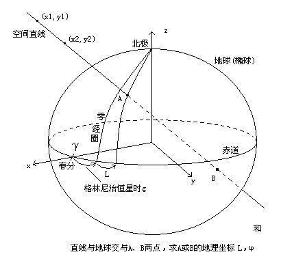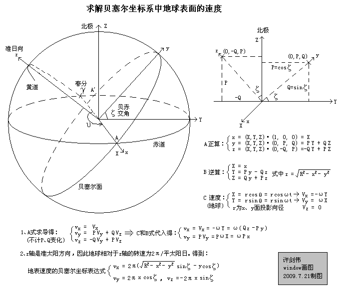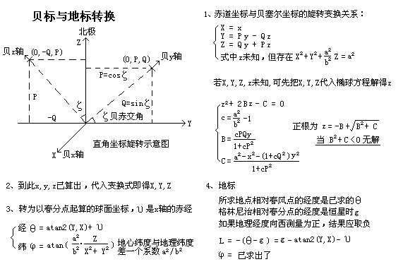 地理坐标与贝塞尔坐标的转换: 我们在一个实际问题中求解。贝塞尔坐标中的点P(x,y,z)落在地球表面,z轴赤经赤纬是(υ,90-ζ),格林尼治恒星时为g,地球赤道半径为a与极半径为b,若z未知,试求z的值。